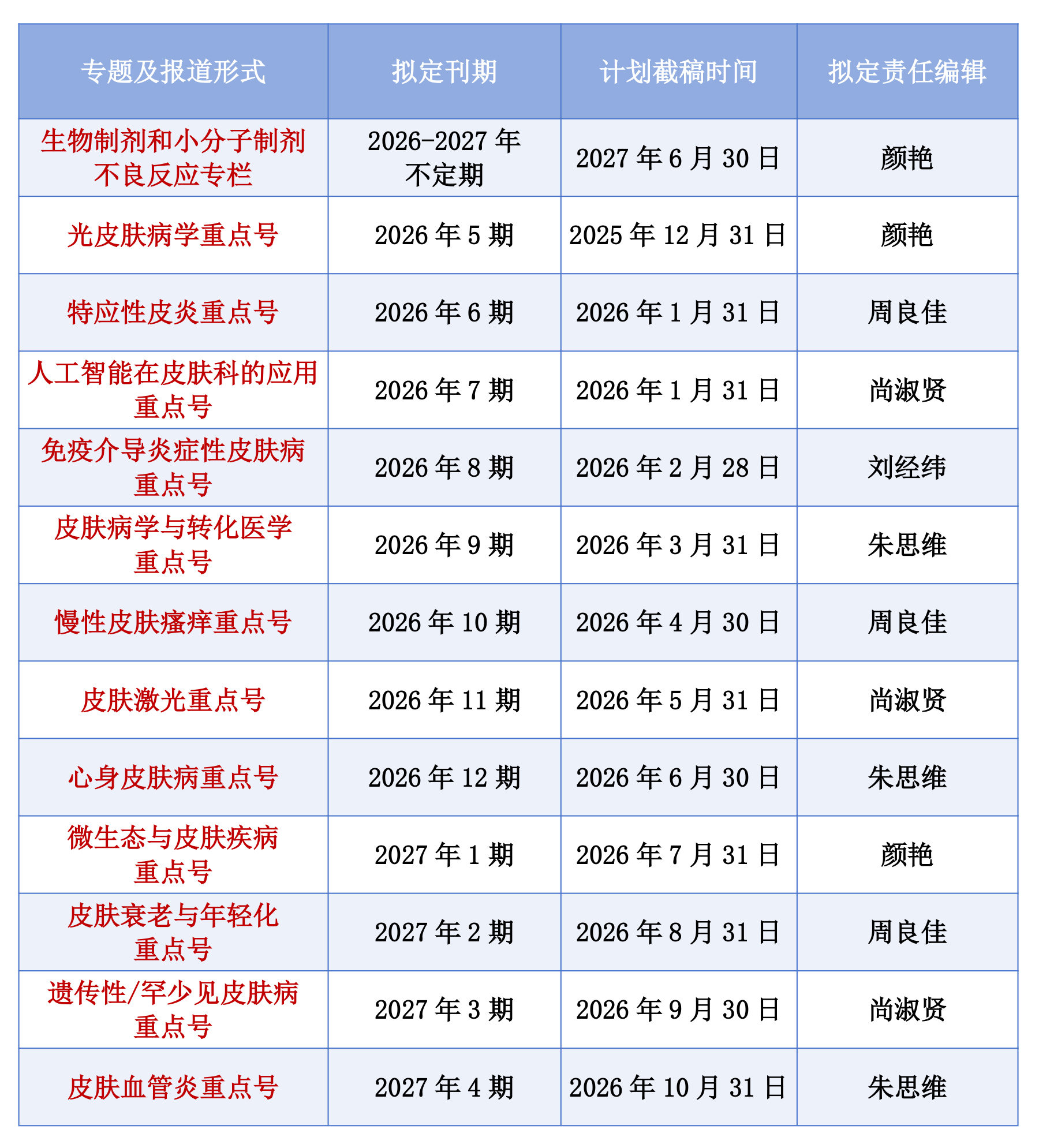 《中华皮肤科杂志》2026—2027年部分专题报道计划如下,欢迎大家积极投稿!